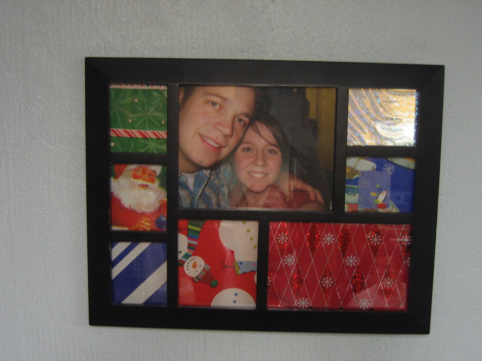 This is a picture frame with all of the wrapping paper we've gotten for this year, along with a picture of us. It's like...a momento of our first Christmas...also, we had picture frames that weren't being used.